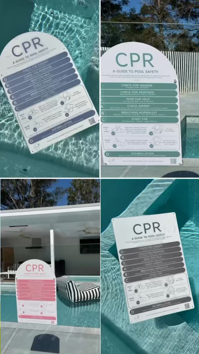 A CPR pool sign with clear instructions on how to perform resuscitation is vital in any pool area. It can save valuable time in an emergency.
